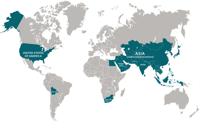 Bolivia, the U.S., South Africa, Pakistan, India, Thailand, Nepal, Bangladesh, and undisclosed areas in the Middle East and Asia.
