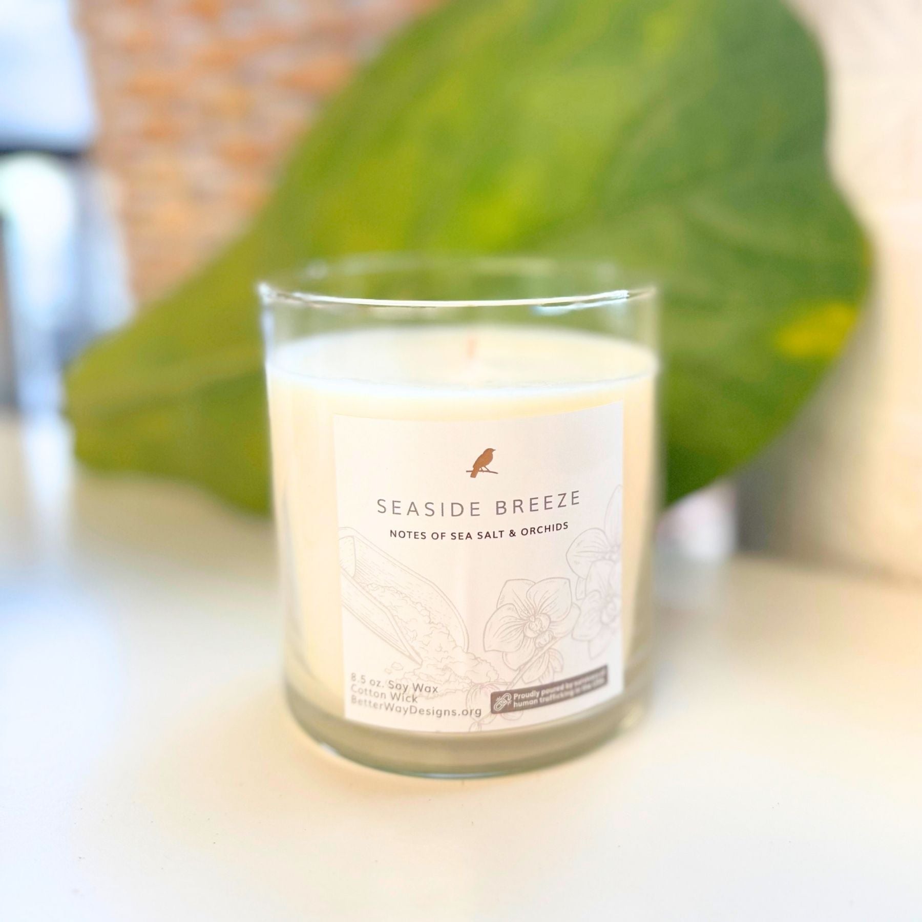 Create a relaxing ambiance in your home with our 8.5oz Glass Jar Candle in Seaside Breeze. The refreshing scent of sea salt and orchids will transport you to the ocean, providing all the comfort of the beach without the hassle of sand. Indulge in a tranquil atmosphere with this true-to-its-name candle.
