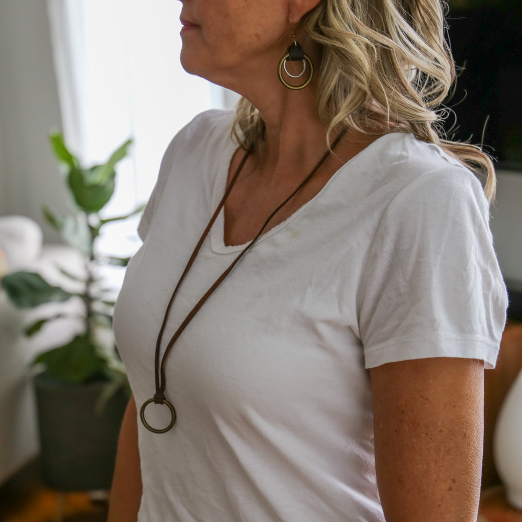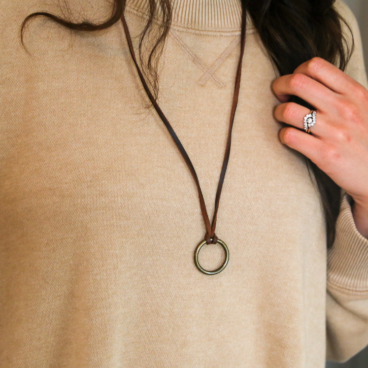 Indulge in the understated luxury of the Brenna Necklace. Skillfully crafted from upcycled leather and accented with a shining brass ring, this necklace exudes a refined elegance. Elevate any outfit with this sophisticated accessory that also benefits the environment.