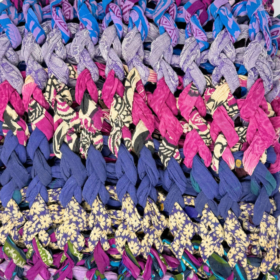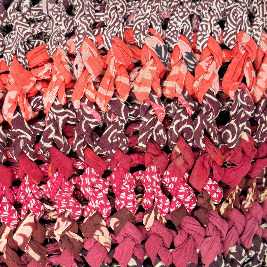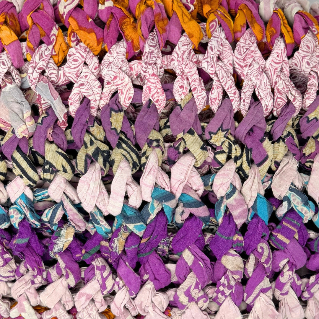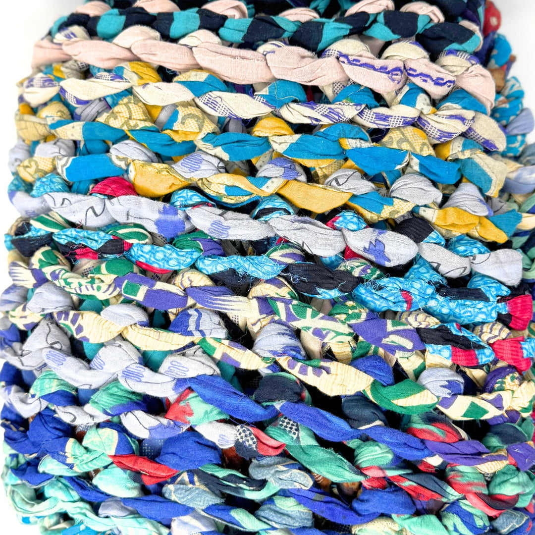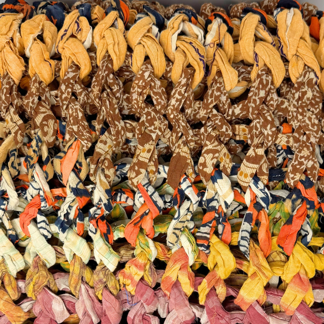 Introducing our vibrant and eco-friendly chunky knit blankets, expertly peg loomed using up-cycled sari cloth. These blankets showcase a stunning array of colors and patterns, each one unique due to the nature of the reclaimed materials. The up-cycled sari cloth gives these blankets a rich texture and a touch of cultural heritage, making them not only beautiful but also meaningful. These chunky knit blankets are not just functional but also add a touch of bohemian elegance to any space. The thick, woven texture provides warmth and comfort, making them perfect for snuggling up during colder months or as a decorative throw year-round.