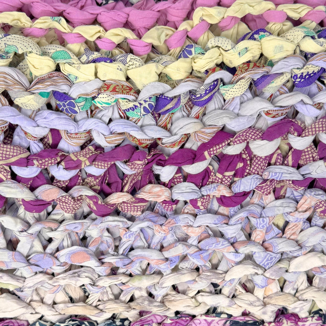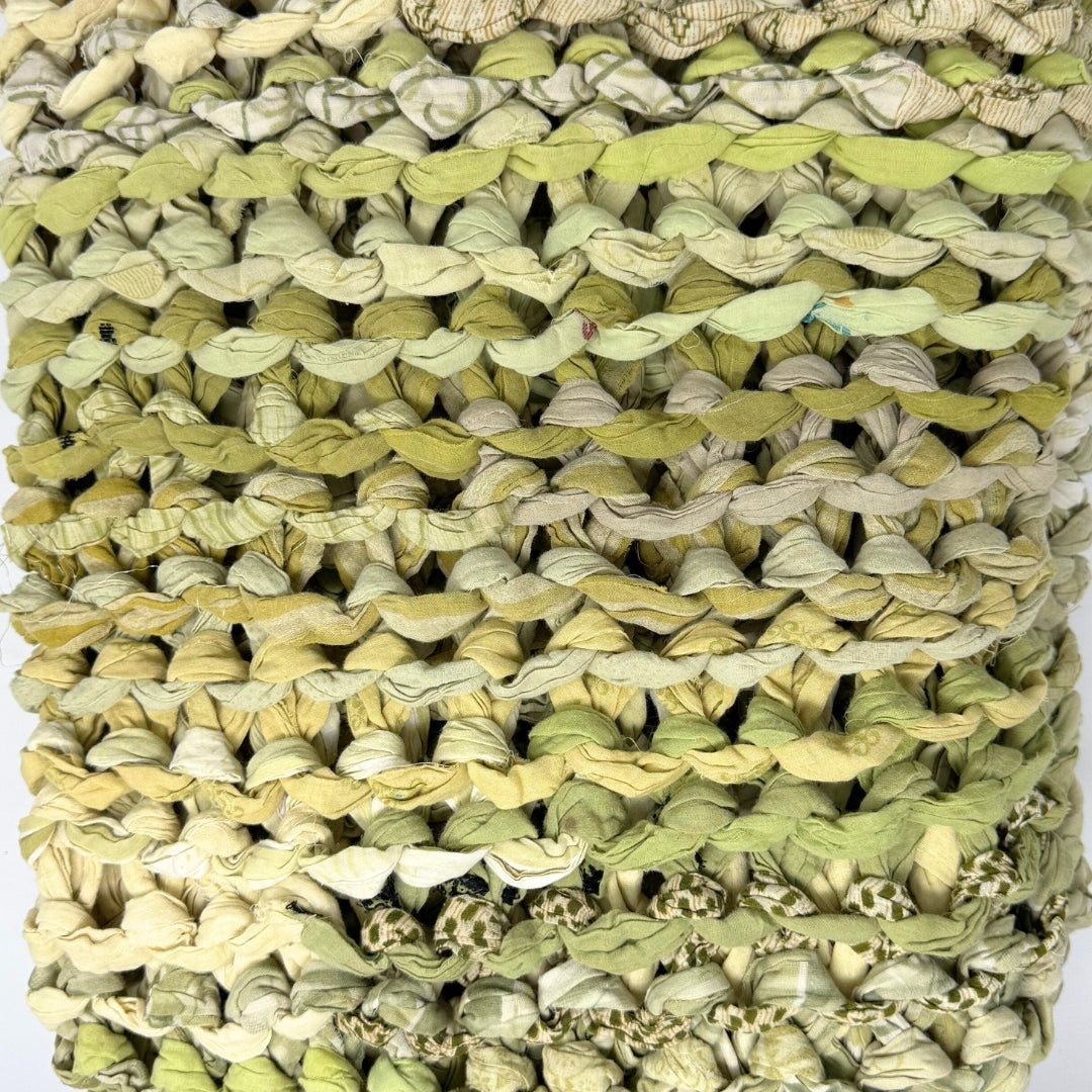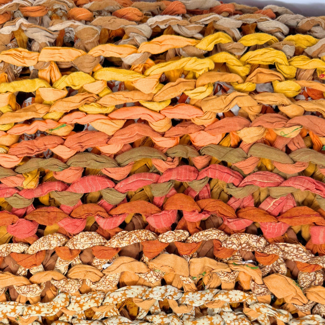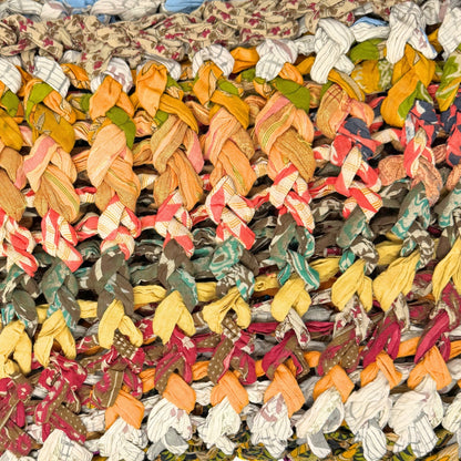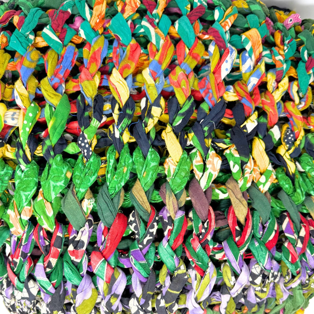 Introducing our vibrant and eco-friendly chunky knit blankets, expertly peg loomed using up-cycled sari cloth. These blankets showcase a stunning array of colors and patterns, each one unique due to the nature of the reclaimed materials. The up-cycled sari cloth gives these blankets a rich texture and a touch of cultural heritage, making them not only beautiful but also meaningful. These chunky knit blankets are not just functional but also add a touch of bohemian elegance to any space. The thick, woven texture provides warmth and comfort, making them perfect for snuggling up during colder months or as a decorative throw year-round.