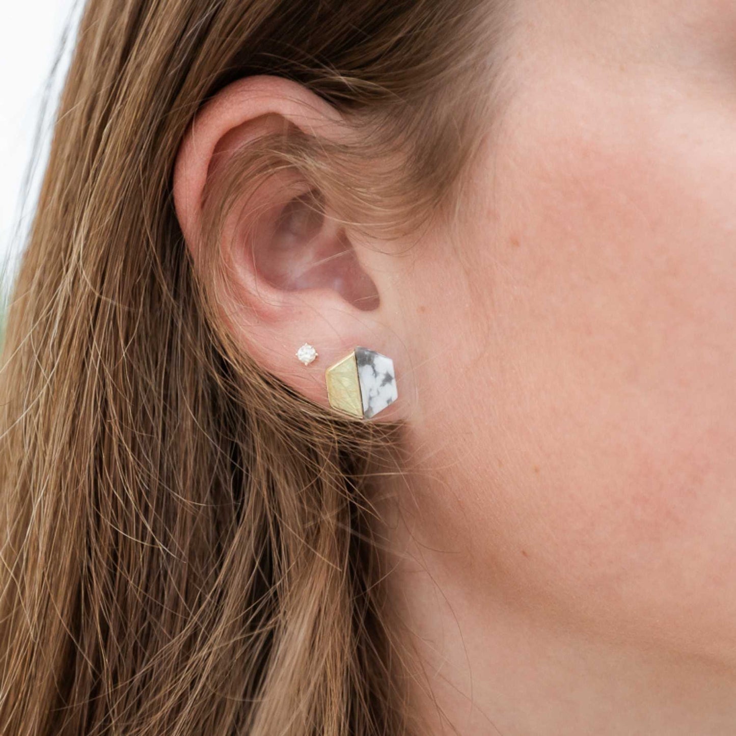 Elevate your style with these stunning hexagon stud earrings, crafted from luxurious gold and elegant marble. Featuring a sleek geometric design, these earrings blend modern sophistication with timeless beauty, making them the perfect accessory for any occasion.