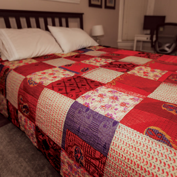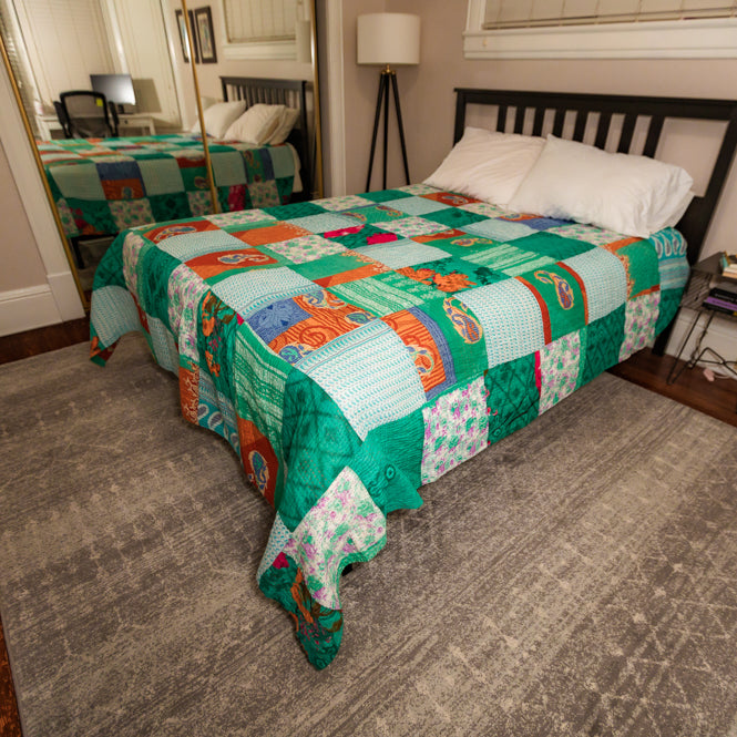 Each blanket is a one-of-a-kind creation, made from repurposed sari materials that give it a rich and diverse visual appeal. The patchwork design combines various sections of saris, resulting in a harmonious blend of colors and intricate patterns. This artisanal approach ensures that no two blankets are exactly alike, offering a truly unique piece for your home. These blankets come in both queen and king sizes, providing ample coverage and comfort for any bed. The recycled sari fabric not only adds a touch of cultural elegance but also promotes sustainable practices, making these blankets an eco-friendly choice for your bedding needs. The patchwork style highlights the beauty and diversity of traditional sari patterns, featuring a mix of florals, geometric designs, and intricate motifs. The blue color theme, as pictured, showcases shades of blue, turquoise, and accents of white and purple, creating a calming and serene aesthetic. Similar attention to detail and vibrant combinations can be found in the green, orange/yellow, pink/purple, and red themes, each offering its own distinct charm.