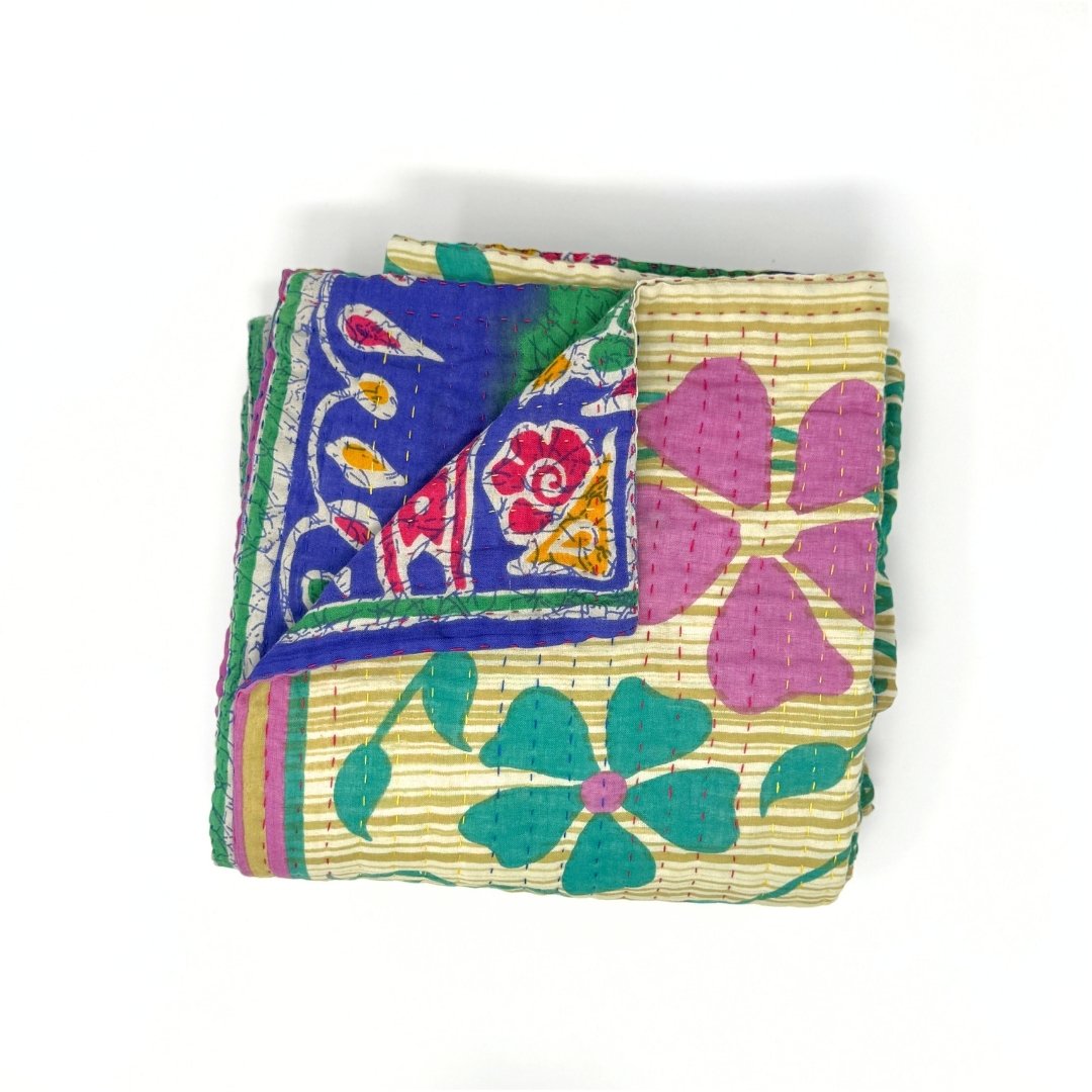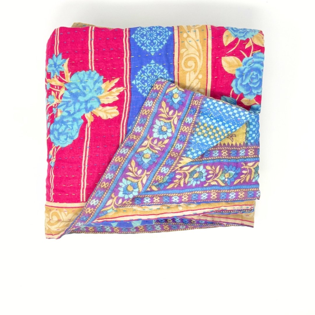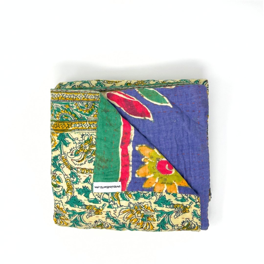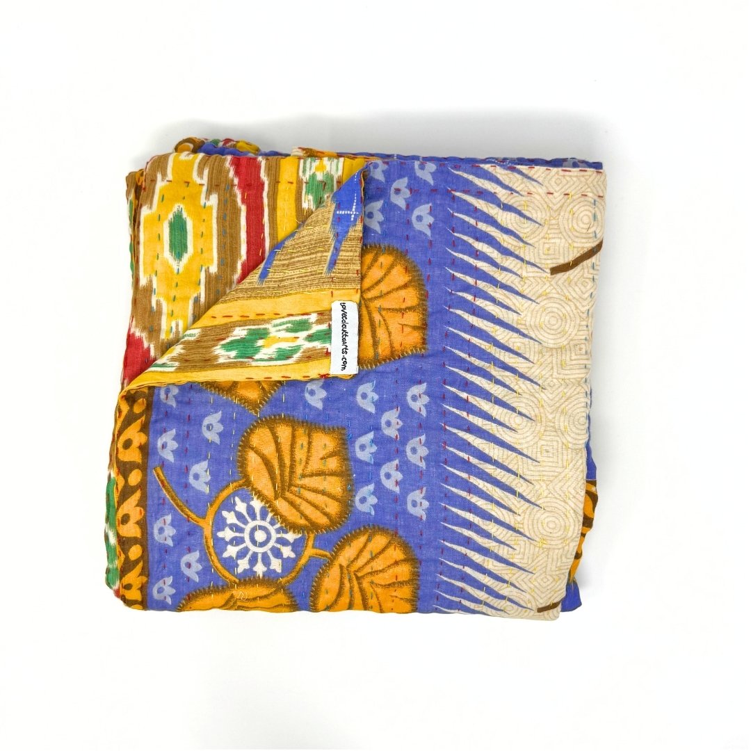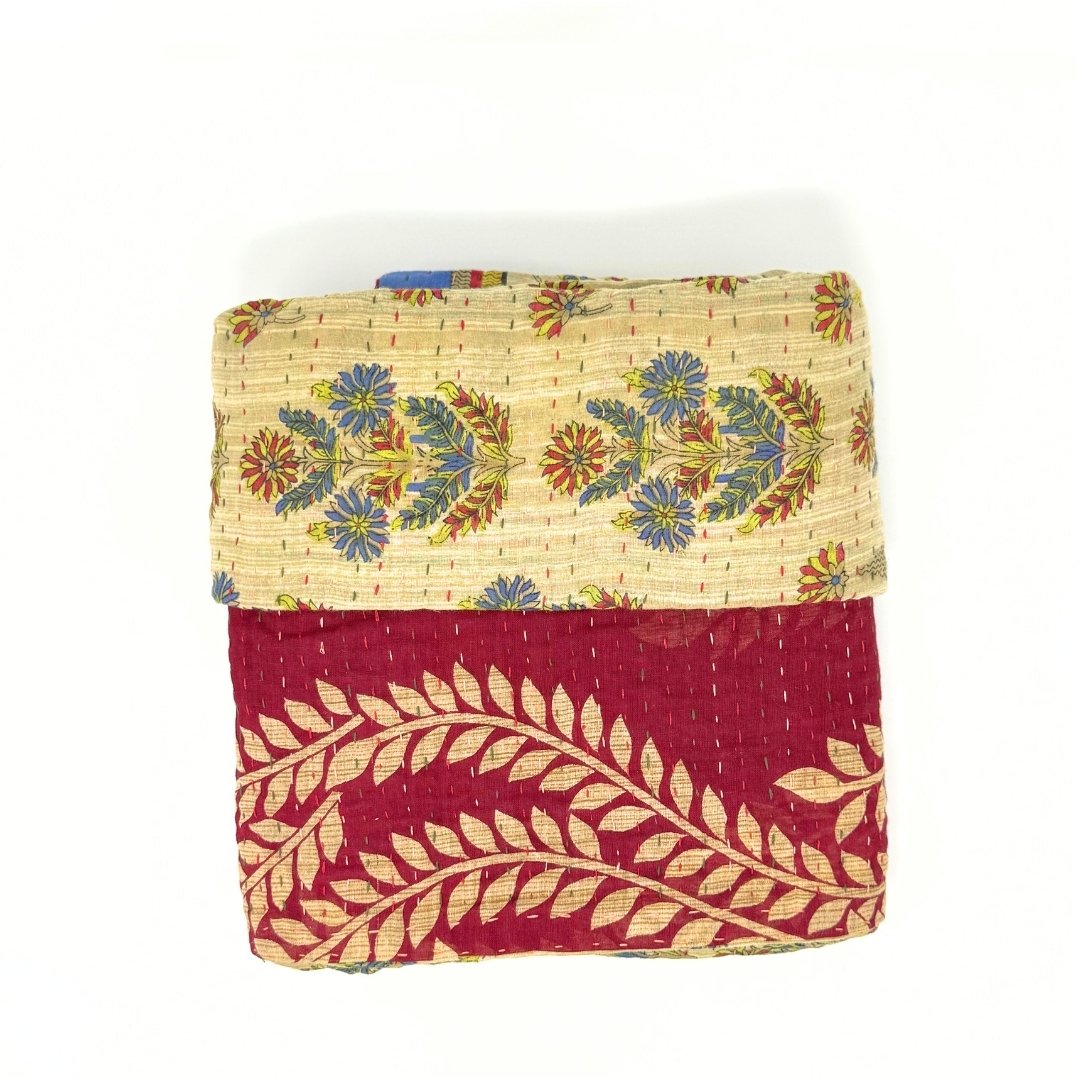 Each blanket is meticulously hand-quilted by skilled artisans, ensuring exceptional quality and attention to detail. The recycled sari fabric offers a rich and diverse visual appeal, with every blanket featuring a harmonious blend of florals, geometrics, and traditional motifs. This artisanal approach ensures that no two blankets are ever exactly alike, providing a truly unique piece for your home. Each blanket showcases a cohesive and harmonious blend of colors and motifs from a single sari, ensuring a uniform and elegant look. The seamless design enhances the visual appeal and maintains the integrity of the original sari fabric.