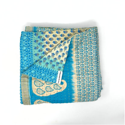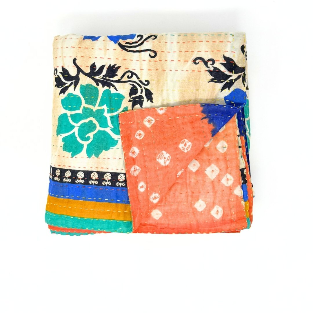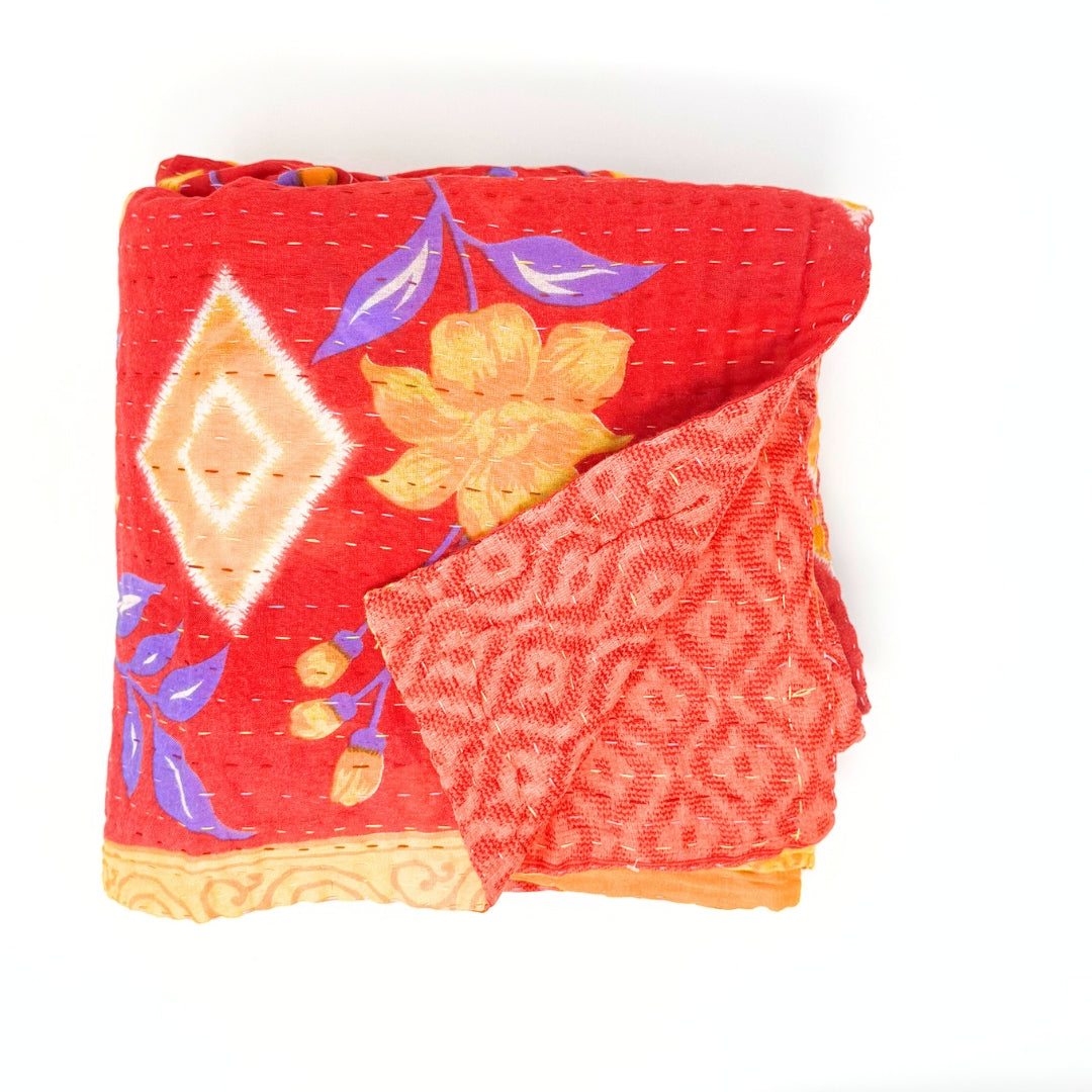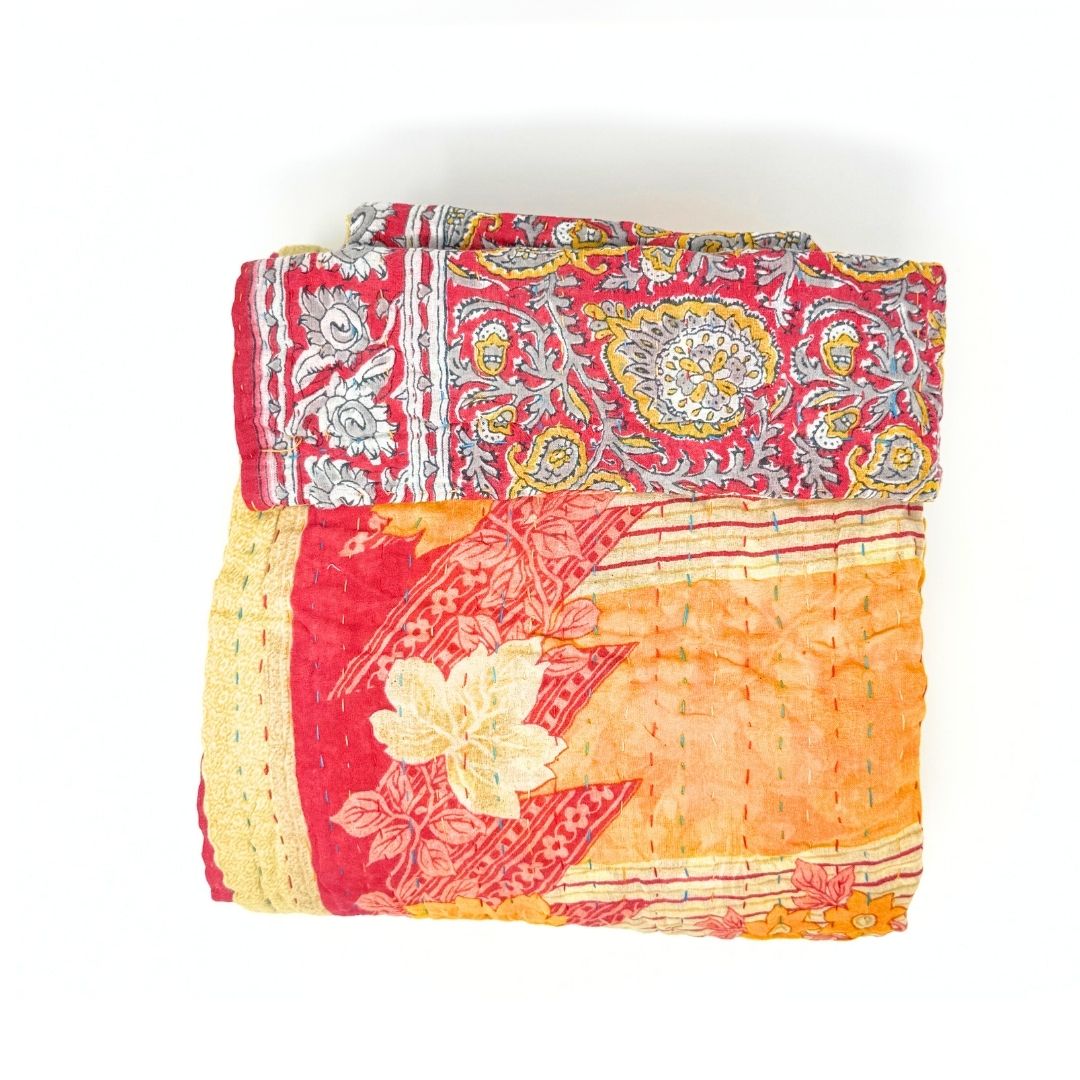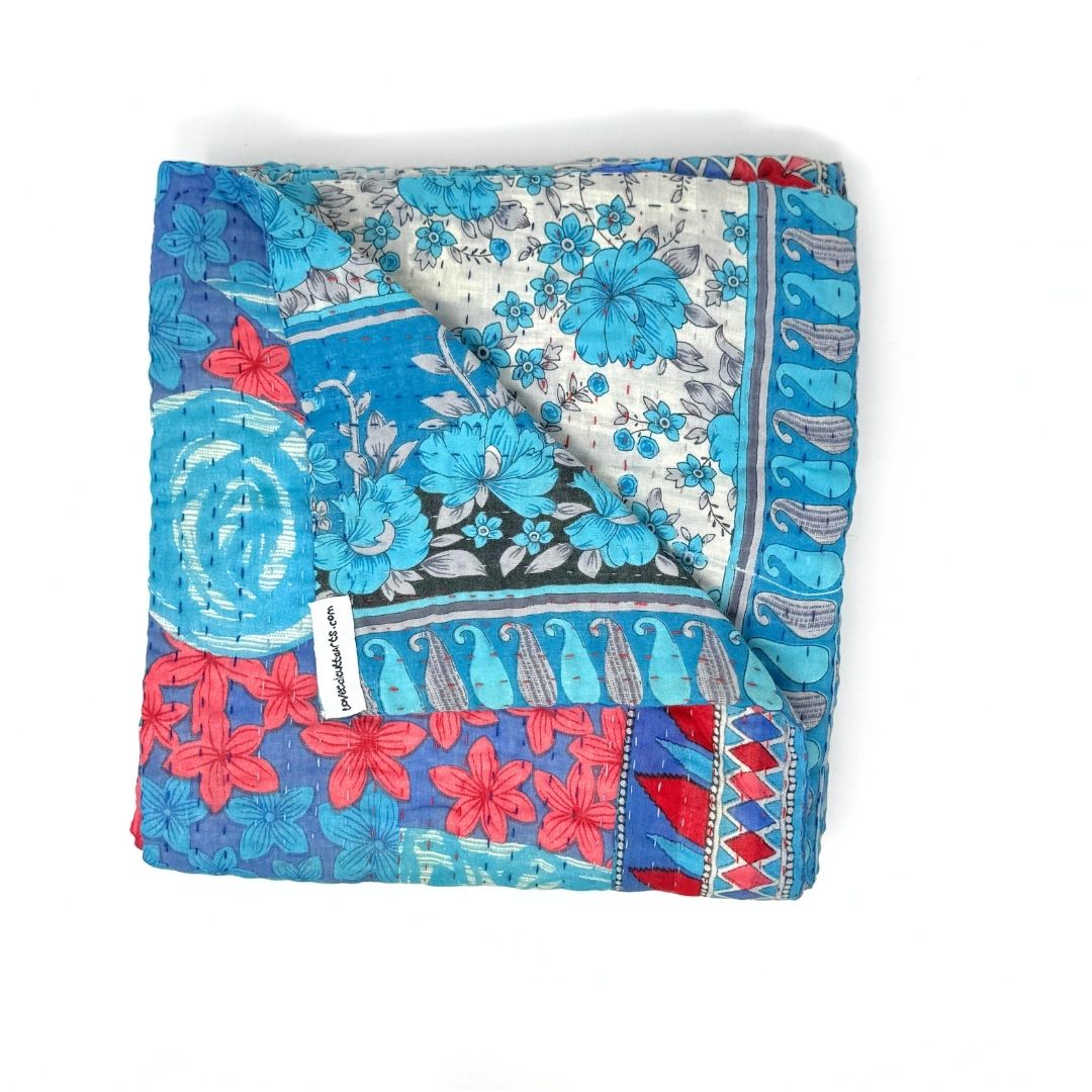 Each blanket is meticulously hand-quilted by skilled artisans, ensuring exceptional quality and attention to detail. The recycled sari fabric offers a rich and diverse visual appeal, with every blanket featuring a harmonious blend of florals, geometrics, and traditional motifs. This artisanal approach ensures that no two blankets are ever exactly alike, providing a truly unique piece for your home. Each blanket showcases a cohesive and harmonious blend of colors and motifs from a single sari, ensuring a uniform and elegant look. The seamless design enhances the visual appeal and maintains the integrity of the original sari fabric.
