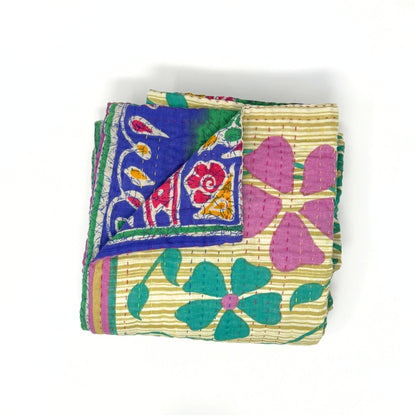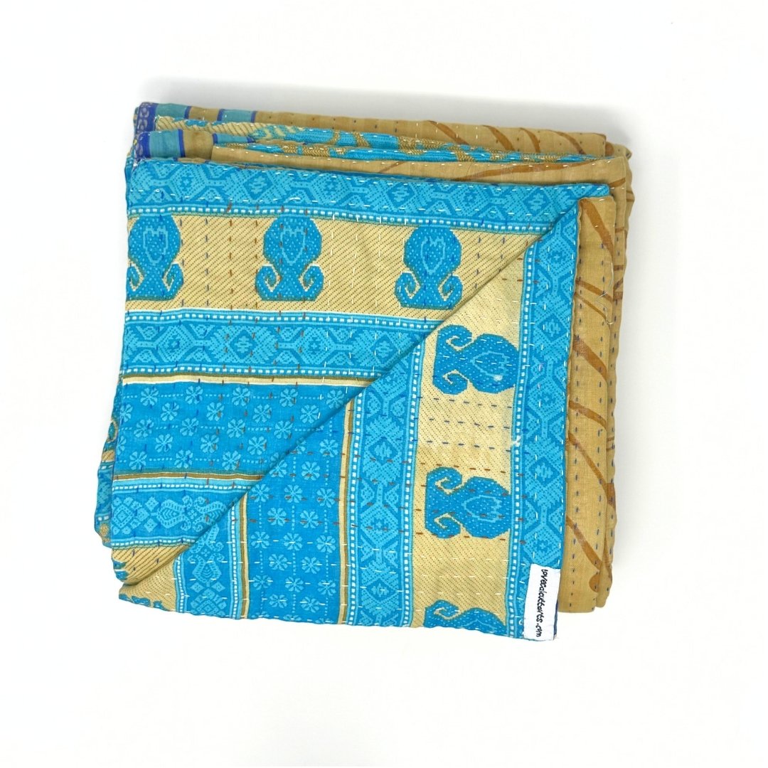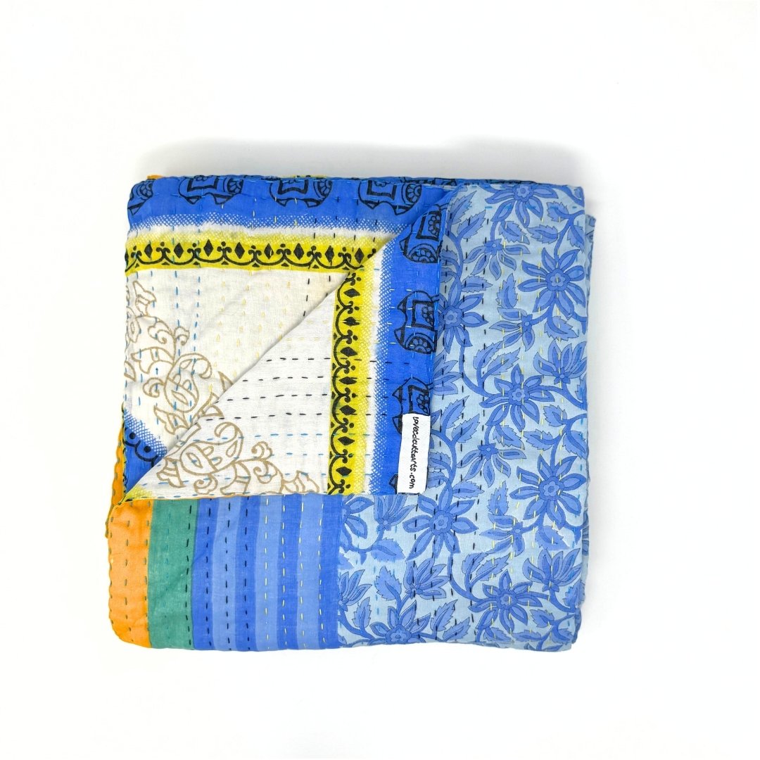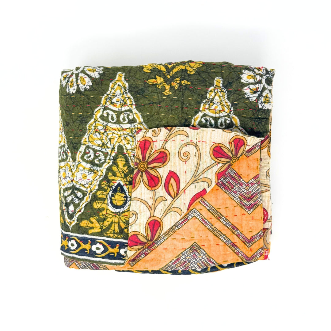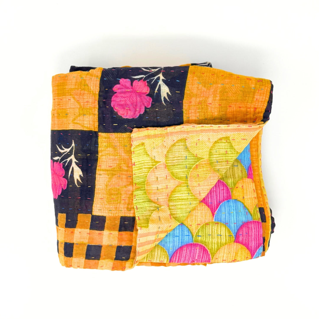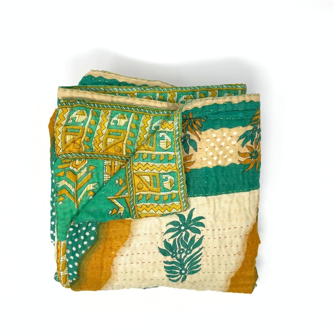 Each blanket is meticulously hand-quilted by skilled artisans, ensuring exceptional quality and attention to detail. The recycled sari fabric offers a rich and diverse visual appeal, with every blanket featuring a harmonious blend of florals, geometrics, and traditional motifs. This artisanal approach ensures that no two blankets are ever exactly alike, providing a truly unique piece for your home. Each blanket showcases a cohesive and harmonious blend of colors and motifs from a single sari, ensuring a uniform and elegant look. The seamless design enhances the visual appeal and maintains the integrity of the original sari fabric.