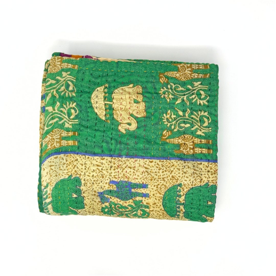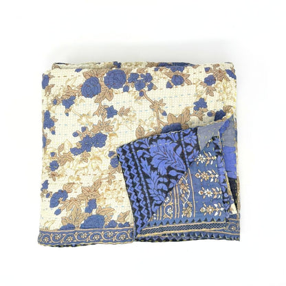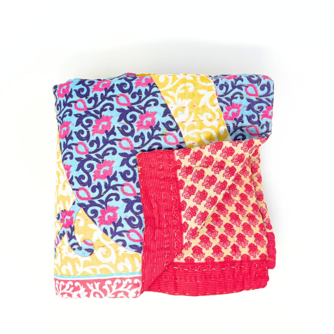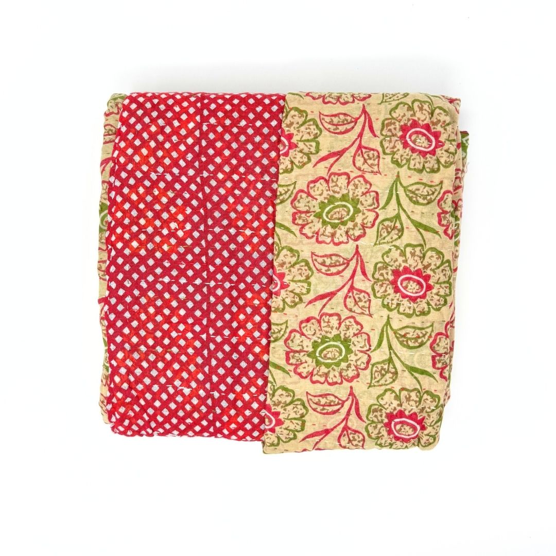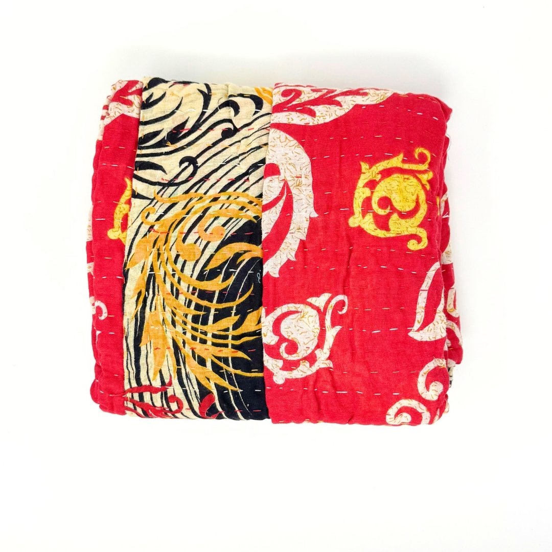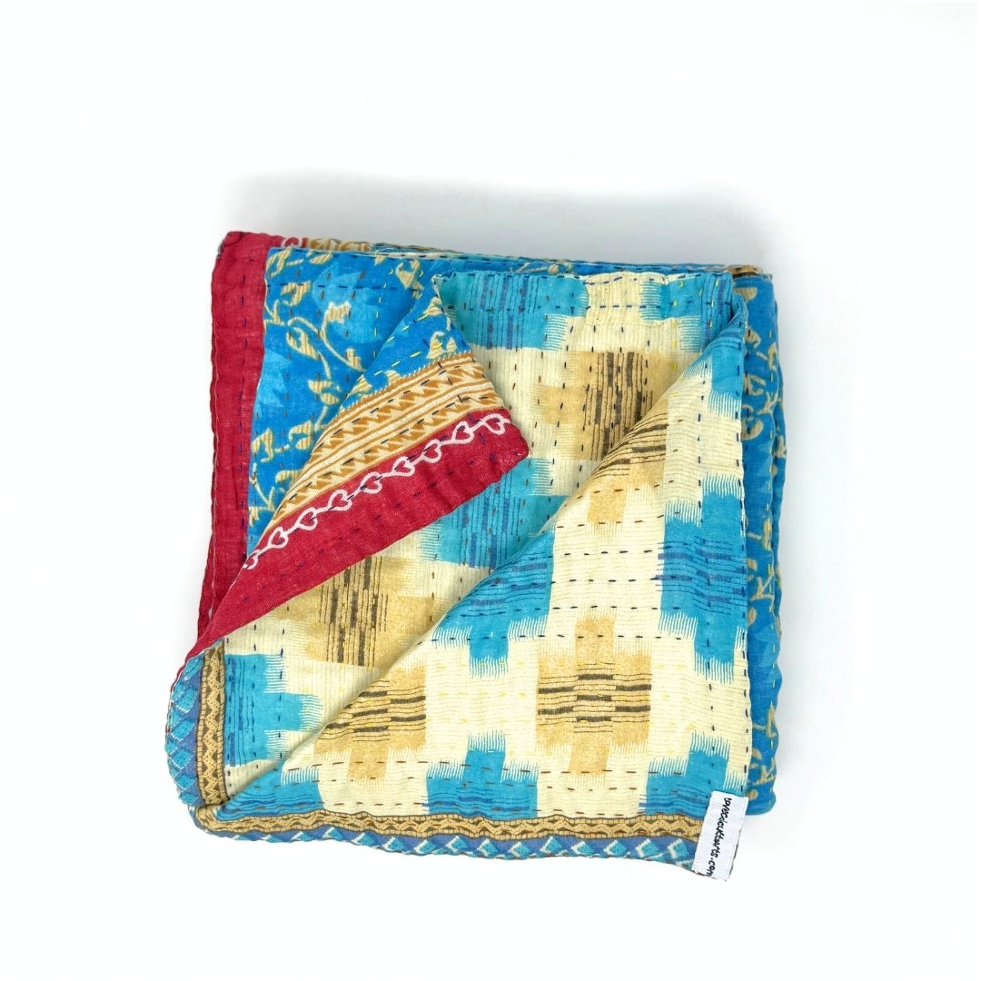 Each blanket is meticulously hand-quilted by skilled artisans, ensuring exceptional quality and attention to detail. The recycled sari fabric offers a rich and diverse visual appeal, with every blanket featuring a harmonious blend of florals, geometrics, and traditional motifs. This artisanal approach ensures that no two blankets are ever exactly alike, providing a truly unique piece for your home. Each blanket showcases a cohesive and harmonious blend of colors and motifs from a single sari, ensuring a uniform and elegant look. The seamless design enhances the visual appeal and maintains the integrity of the original sari fabric.