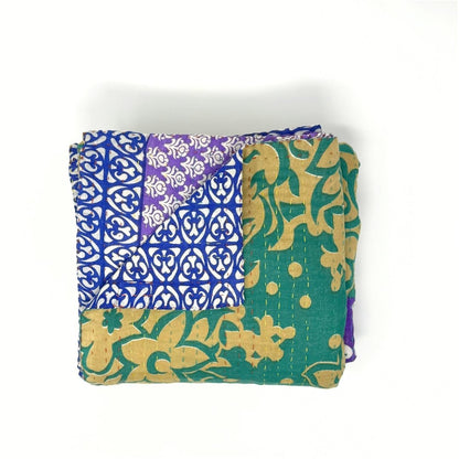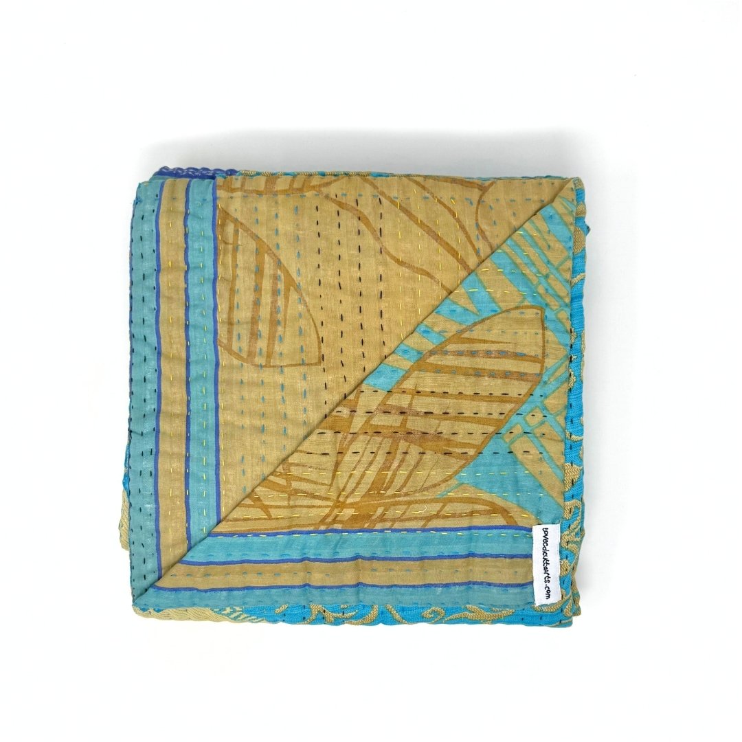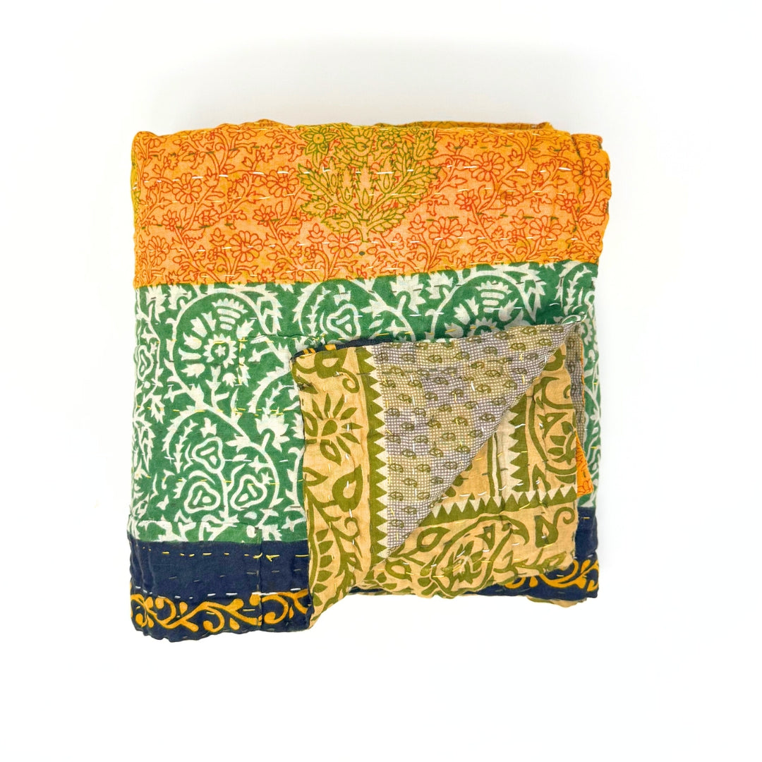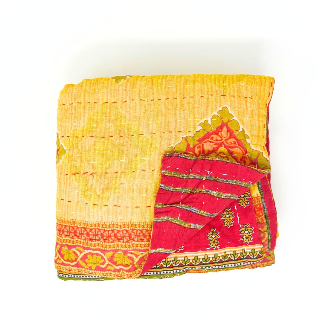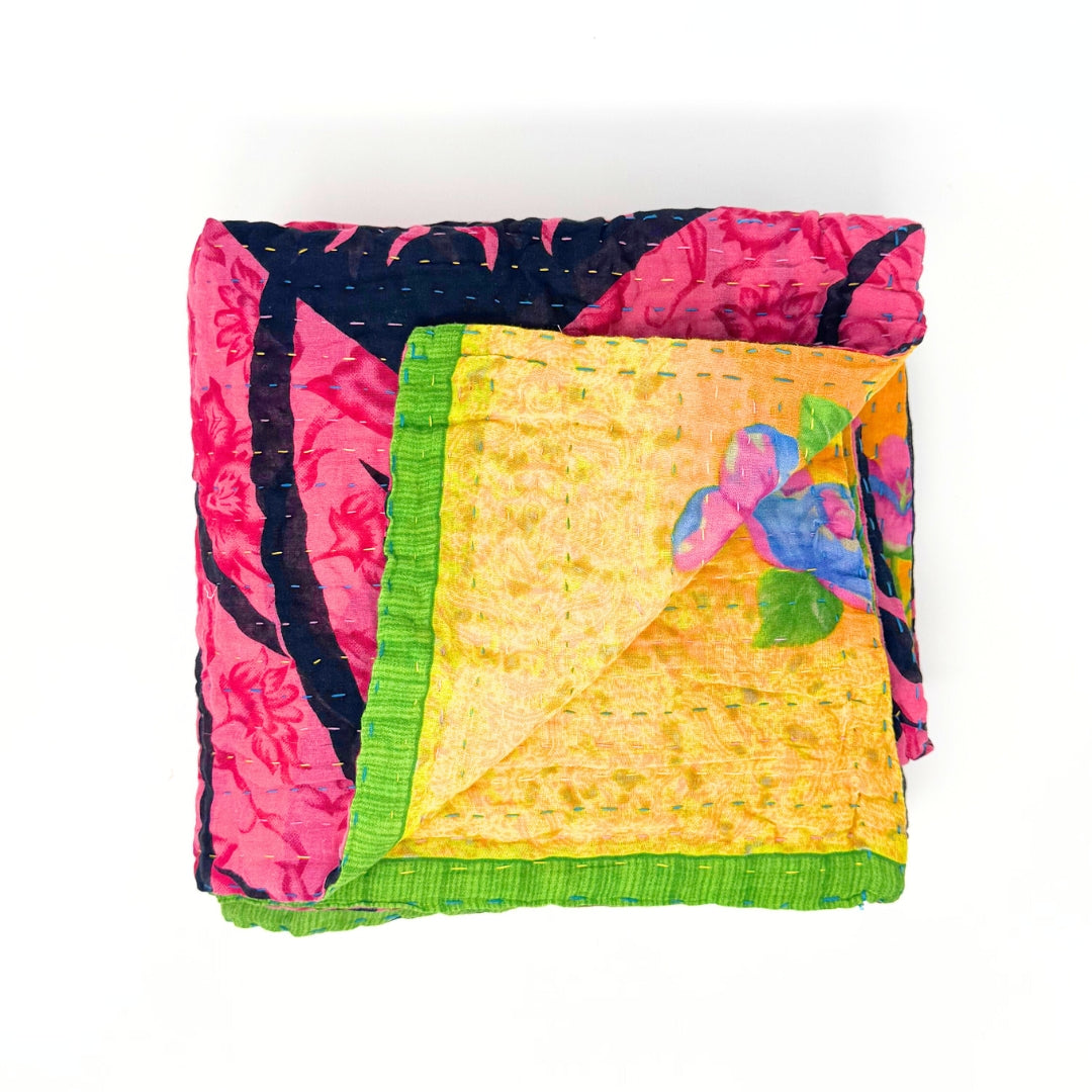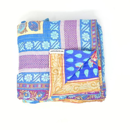 Each blanket is meticulously hand-quilted by skilled artisans, ensuring exceptional quality and attention to detail. The recycled sari fabric offers a rich and diverse visual appeal, with every blanket featuring a harmonious blend of florals, geometrics, and traditional motifs. This artisanal approach ensures that no two blankets are ever exactly alike, providing a truly unique piece for your home. Each blanket showcases a cohesive and harmonious blend of colors and motifs from a single sari, ensuring a uniform and elegant look. The seamless design enhances the visual appeal and maintains the integrity of the original sari fabric.