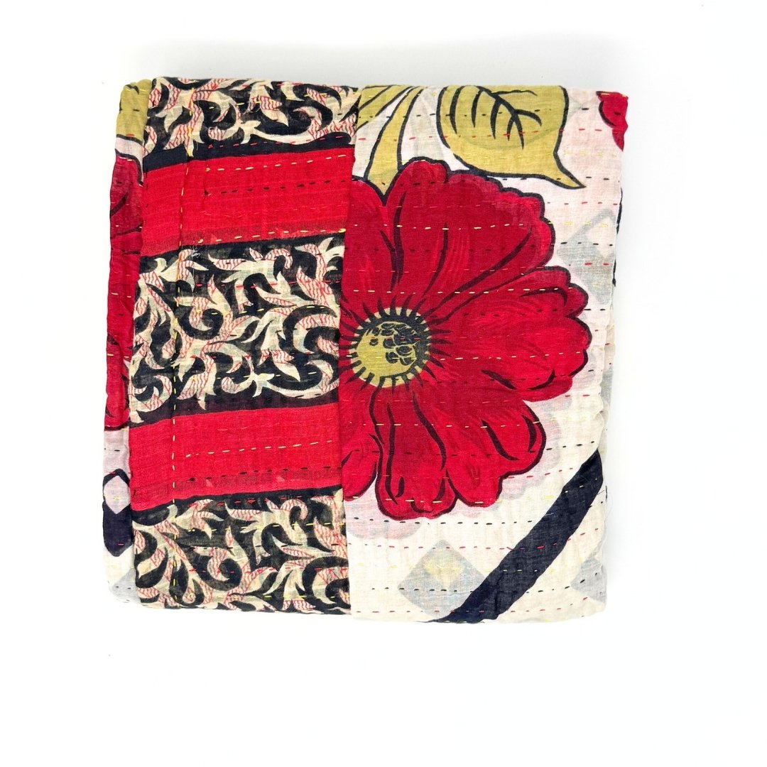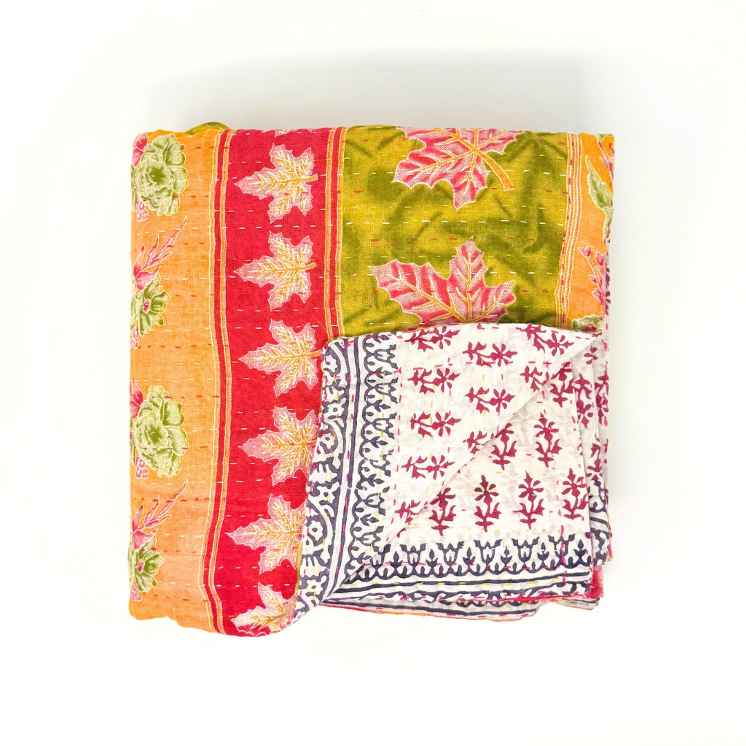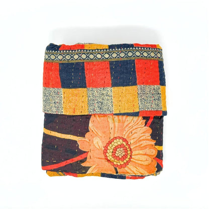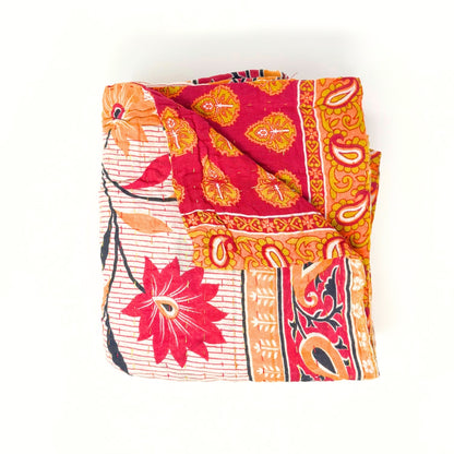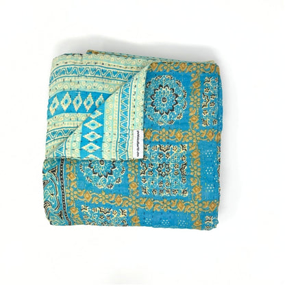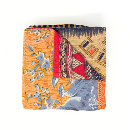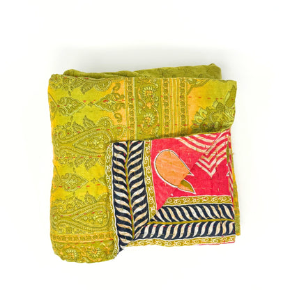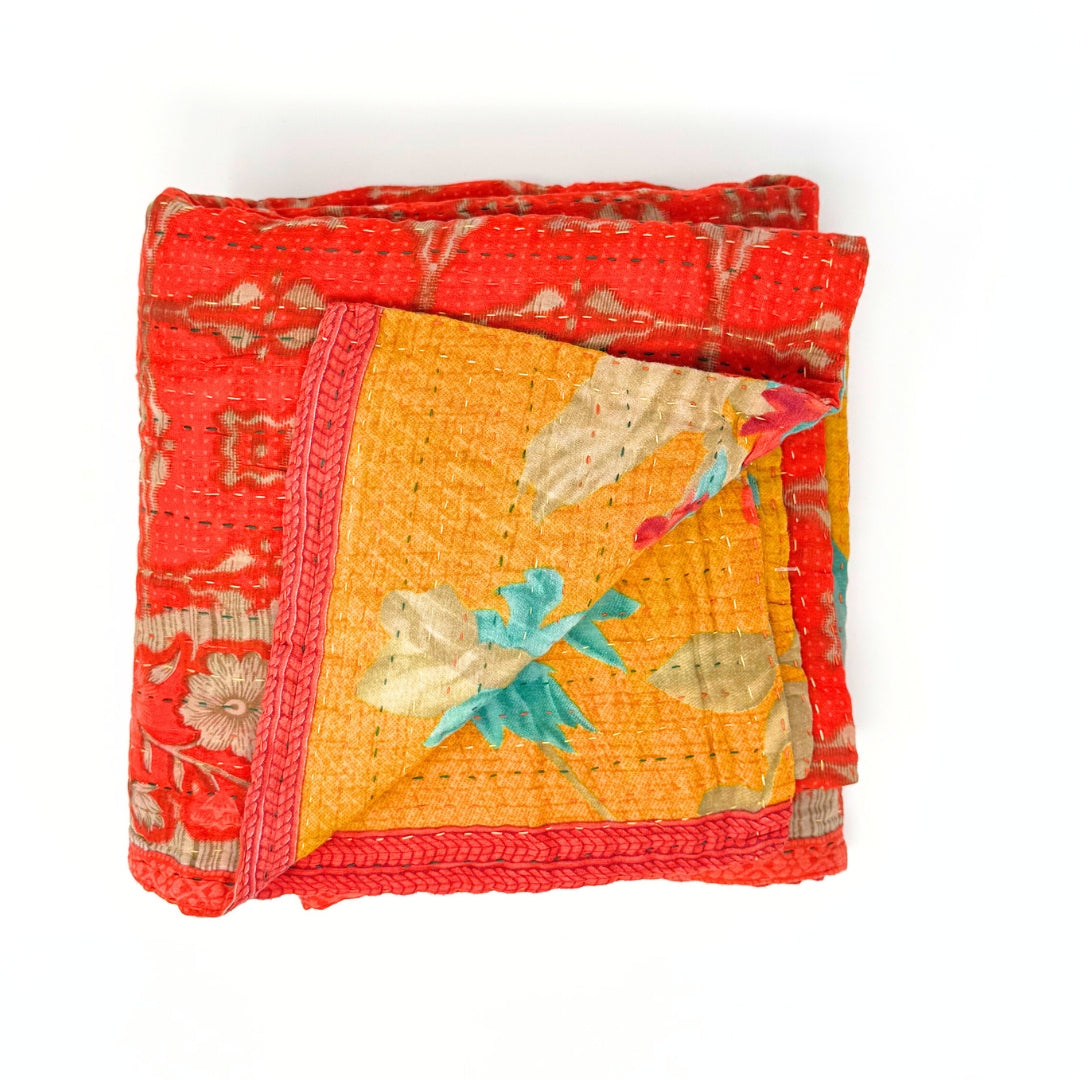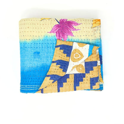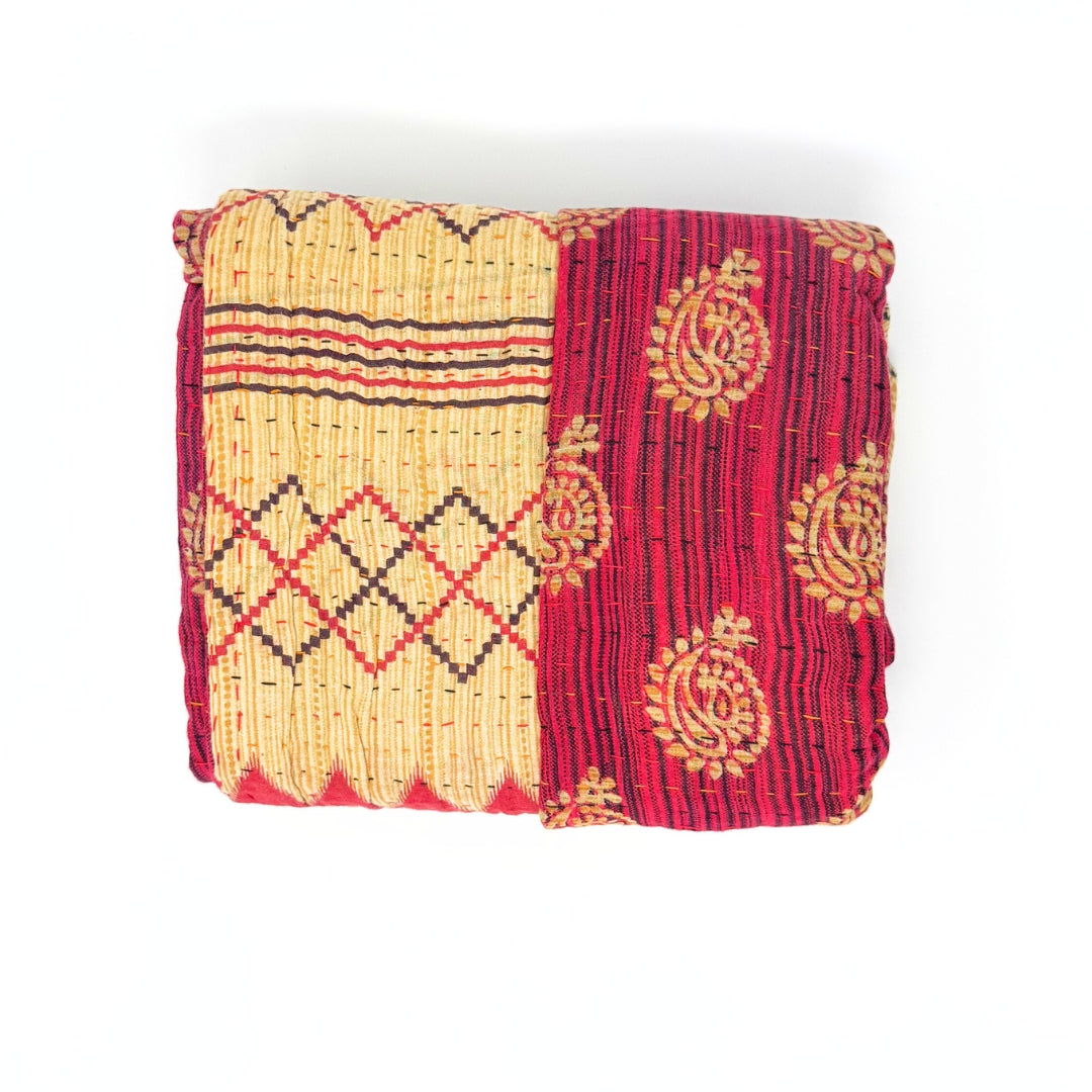 Each blanket is meticulously hand-quilted by skilled artisans, ensuring exceptional quality and attention to detail. The recycled sari fabric offers a rich and diverse visual appeal, with every blanket featuring a harmonious blend of florals, geometrics, and traditional motifs. This artisanal approach ensures that no two blankets are ever exactly alike, providing a truly unique piece for your home. Each blanket showcases a cohesive and harmonious blend of colors and motifs from a single sari, ensuring a uniform and elegant look. The seamless design enhances the visual appeal and maintains the integrity of the original sari fabric.