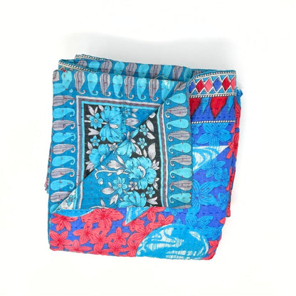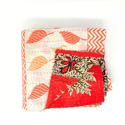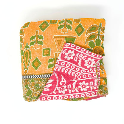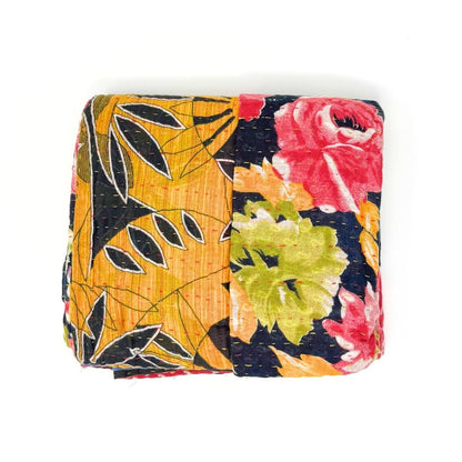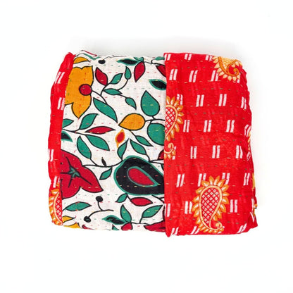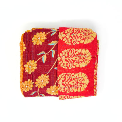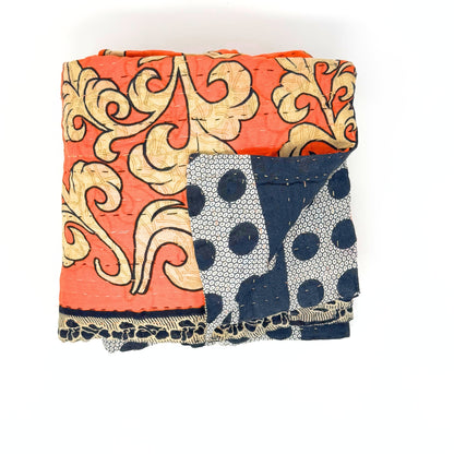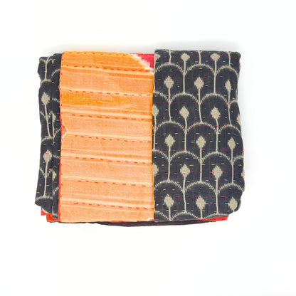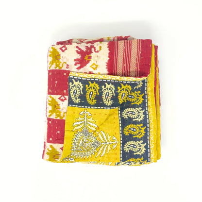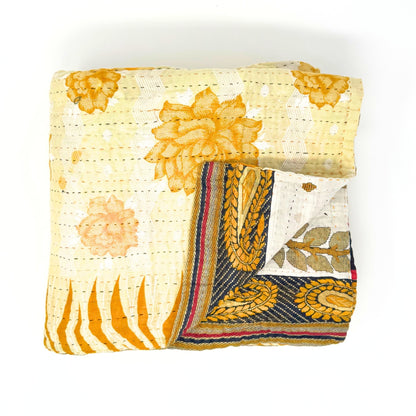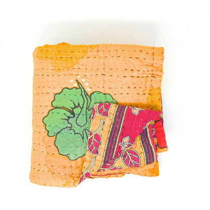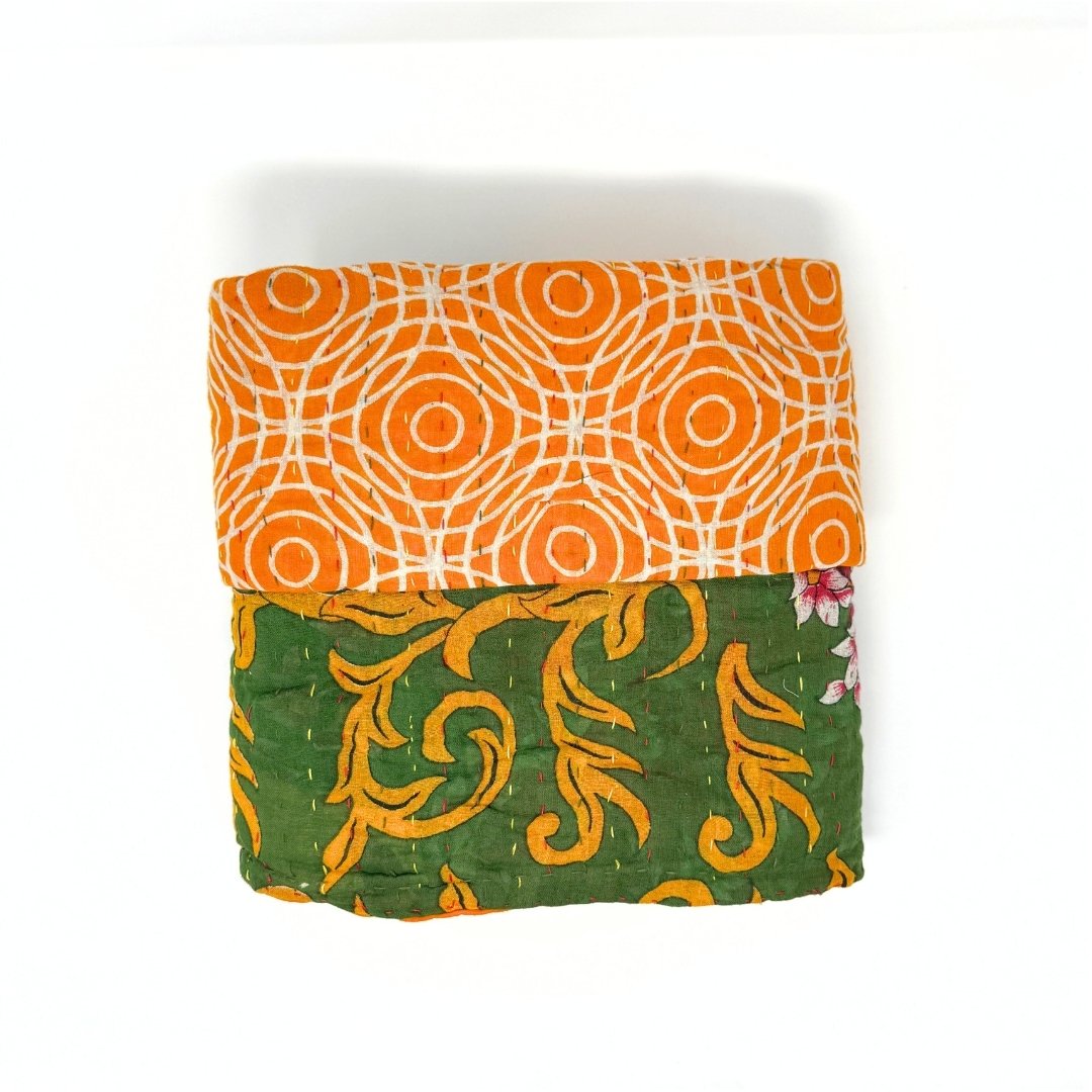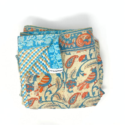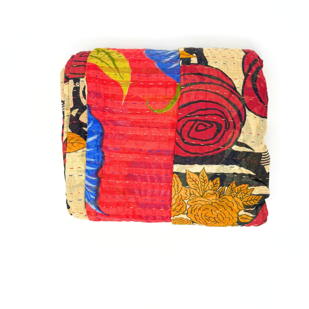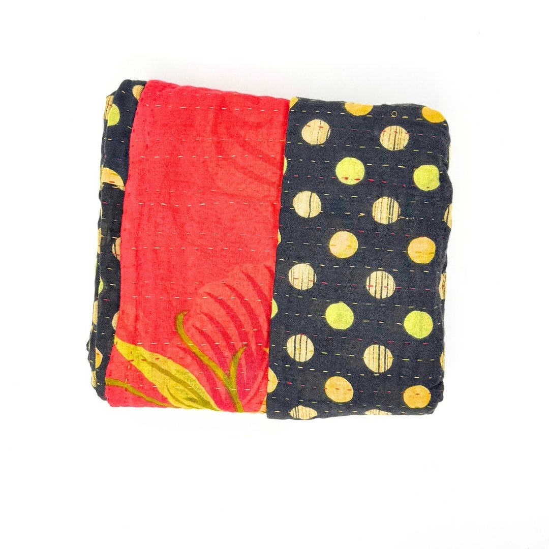Each blanket is meticulously hand-quilted by skilled artisans, ensuring exceptional quality and attention to detail. The recycled sari fabric offers a rich and diverse visual appeal, with every blanket featuring a harmonious blend of florals, geometrics, and traditional motifs. This artisanal approach ensures that no two blankets are ever exactly alike, providing a truly unique piece for your home. Each blanket showcases a cohesive and harmonious blend of colors and motifs from a single sari, ensuring a uniform and elegant look. The seamless design enhances the visual appeal and maintains the integrity of the original sari fabric.