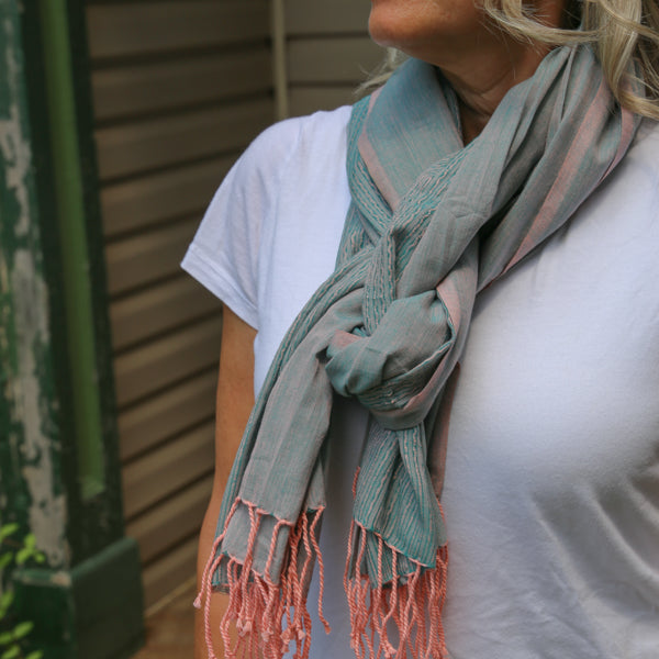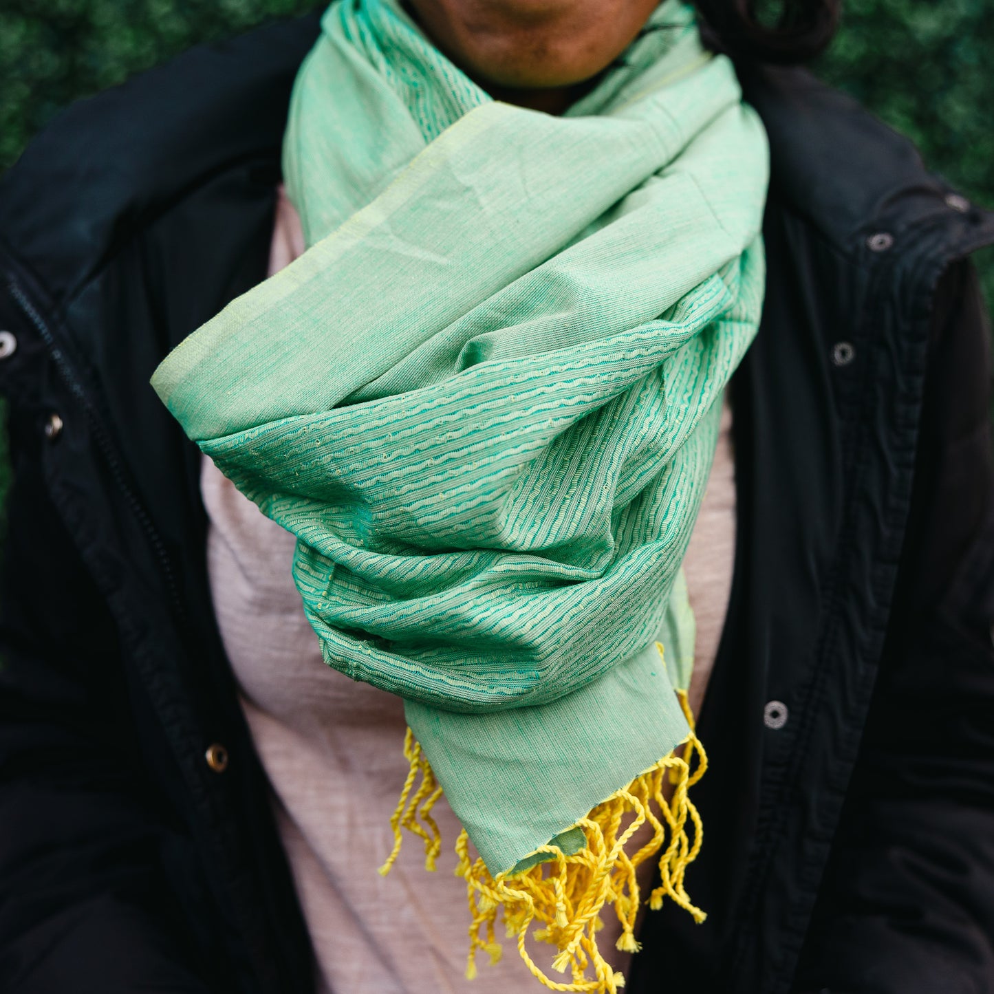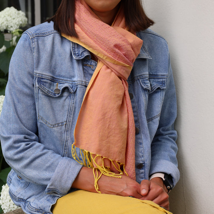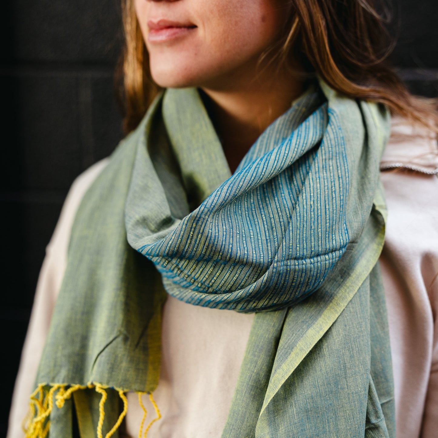 Crafted from soft, breathable 100% cotton, these scarves are gentle on the skin and lightweight, making them ideal for layering in cooler weather or adding a stylish touch to your outfit in warmer months. The high-quality cotton fabric ensures durability and easy maintenance, allowing you to enjoy these scarves for years to come. Each scarf in this collection features a unique, hand-dyed color palette. The scarves come in an array of beautiful colors, including denim blue, kiwi, peach, and turquoise. The ends of each scarf are adorned with delicate fringe detailing, adding a playful and bohemian touch to the overall design.
