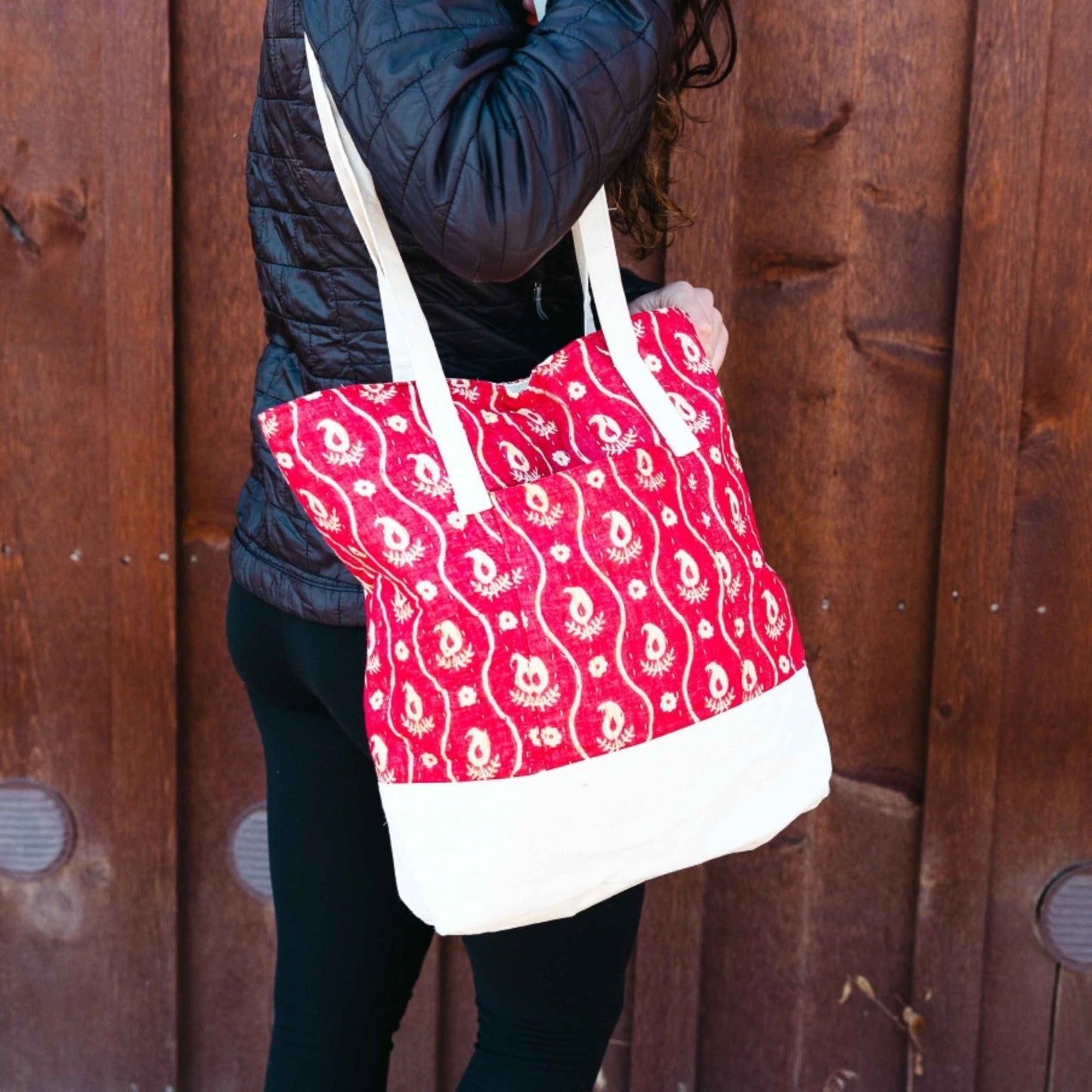 This exquisite tote bag is crafted with an eye for detail and durability, seamlessly blending vibrant, recycled sari fabric with sturdy, natural canvas. The canvas’s neutral cream tone beautifully complements the rich, colorful sari panels, creating a harmonious contrast that highlights the unique patterns and intricate kantha stitching. Each bag is one-of-a-kind, reflecting the bold hues and diverse designs of repurposed saris, ensuring that no two are exactly alike. Both practical and stunning, this tote is designed to make a statement while celebrating sustainable style.