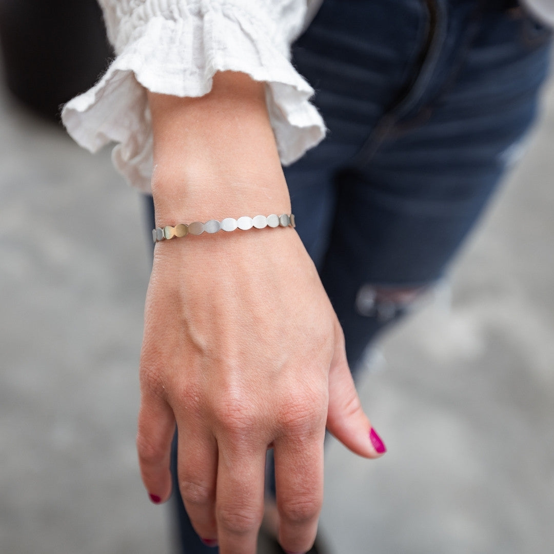 This sleek metal bangle bracelet features a minimalist design with small, evenly spaced circular details, adding a touch of subtle elegance. Made from durable stainless steel, it boasts a modern, shiny silver finish that complements any outfit. Perfect for stacking or wearing solo, this timeless piece effortlessly blends with both casual and dressy styles, making it a versatile addition to your jewelry collection. Adjustable.