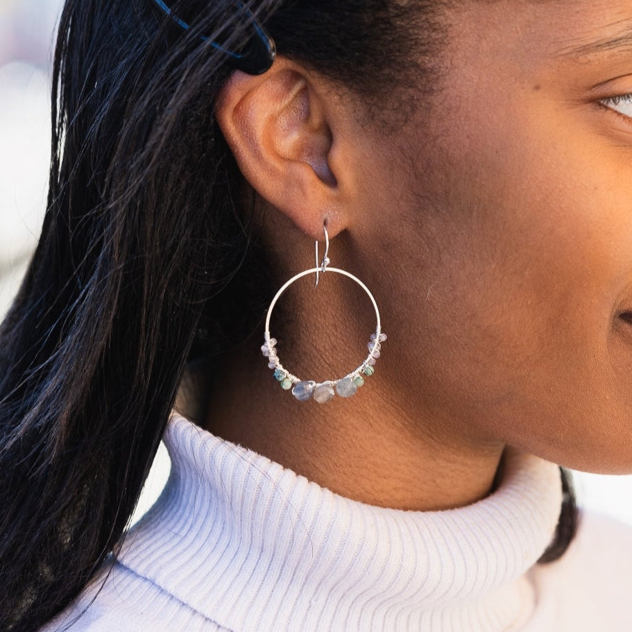 Slip on these stunning Sydney Earrings and let the varied green stones and shimmering silver band elevate any outfit. The glamorous design captures the light, making you shine with confidence. Perfect for a night out or adding a touch of elegance to your everyday look.