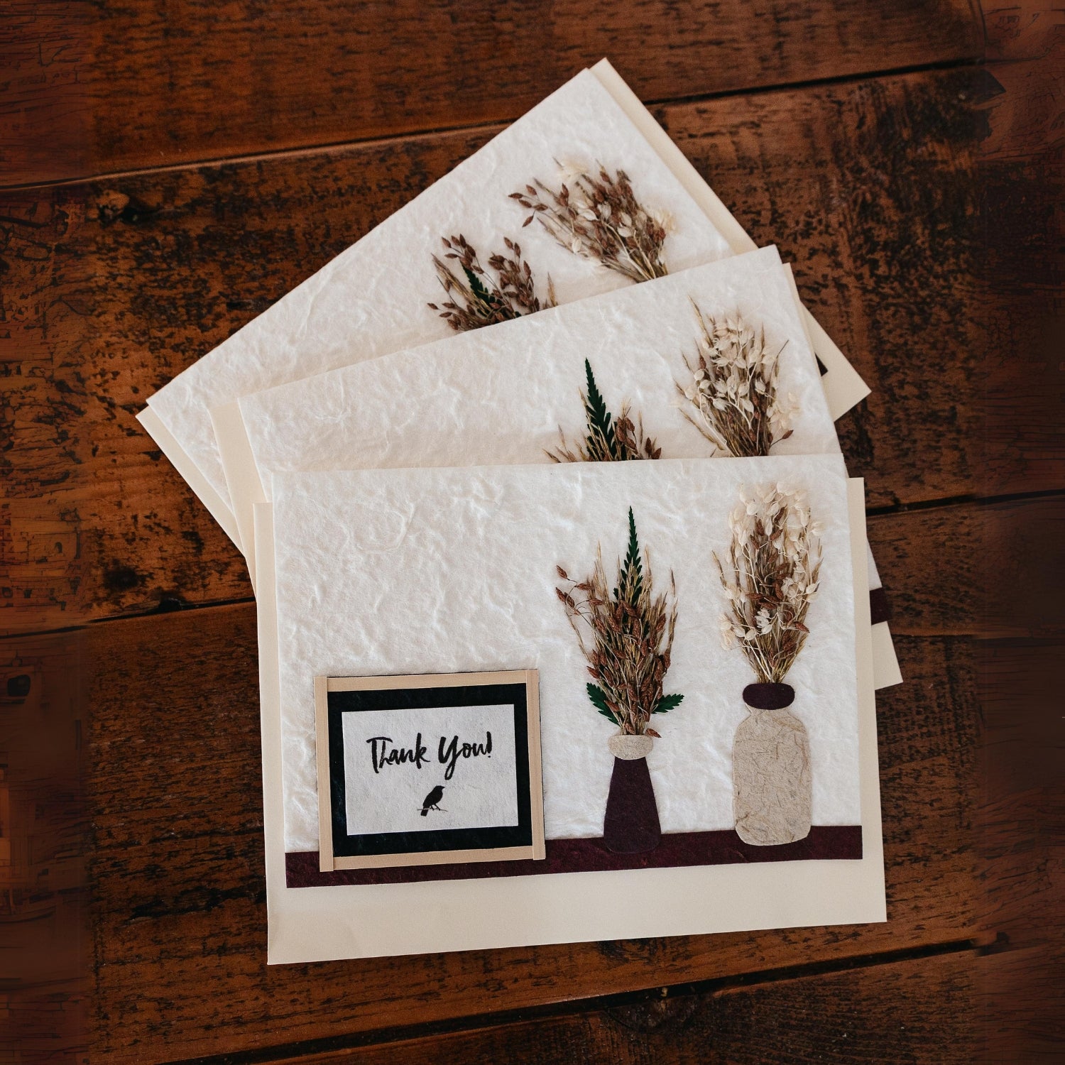 This set of three beautiful "Thank You" cards is handcrafted from mulberry paper, also known as Kozo paper. Each card features a unique, textured finish that highlights the natural beauty of the handmade paper. The front of the cards is adorned with delicate designs, including vases filled with dried flowers, giving each card a rustic and artistic touch. The phrase "Thank You!" is elegantly displayed on each card, making them perfect for expressing your gratitude with a personal and meaningful gesture.